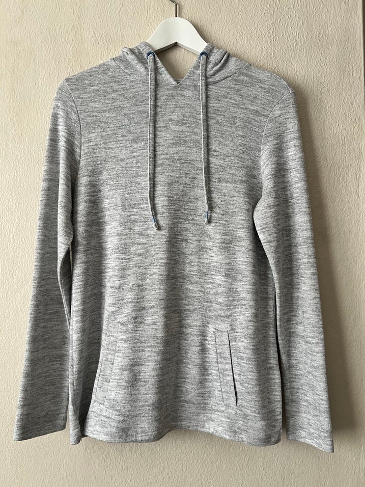 Gri renkli, uzun kollu kapüşonlu kadın sweatshirtü. Yumuşak keten kumaştan, bol kesim ve ön cepli, rahat kullanım için uygundur.Penye değil triko gibi.Bedeni dar olduğu için kullanamadım.M fakat S uyumludur