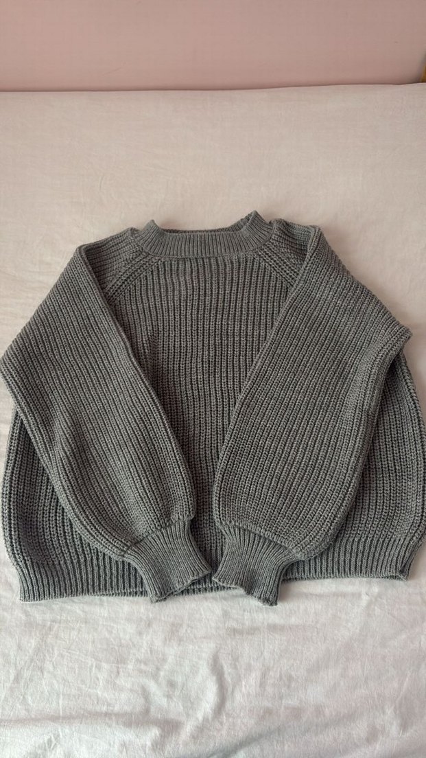 Gri renkte, örgü triko kumaştan, bol kesim ve bisiklet yaka, uzun kollu kadın kazak. Günlük kullanıma uygun, sade ve rahat bir model.