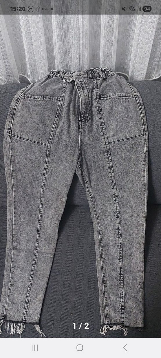 Gri renkli, kemerli ve midi boy regular fit denim pantolon, sade deseniyle günlük rahat sokak stili için uygundur.