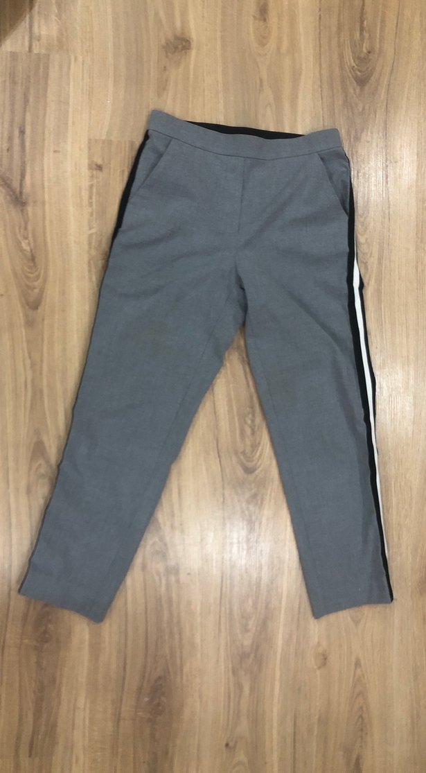 Gri kadın kumaş pantolon, kemerli ve rahat yumuşak kumaştan. Siyah beyaz yan şerit detaylı, günlük sokak stiline uygun.