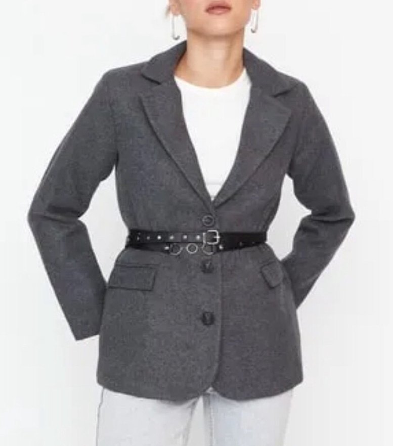 Gri renkli, kemerli ve normal boyda kadın blazer. Yaka kısmı kesik, yün kumaştan, askılı kollu ve iş ile sokak tarzına uygun.
