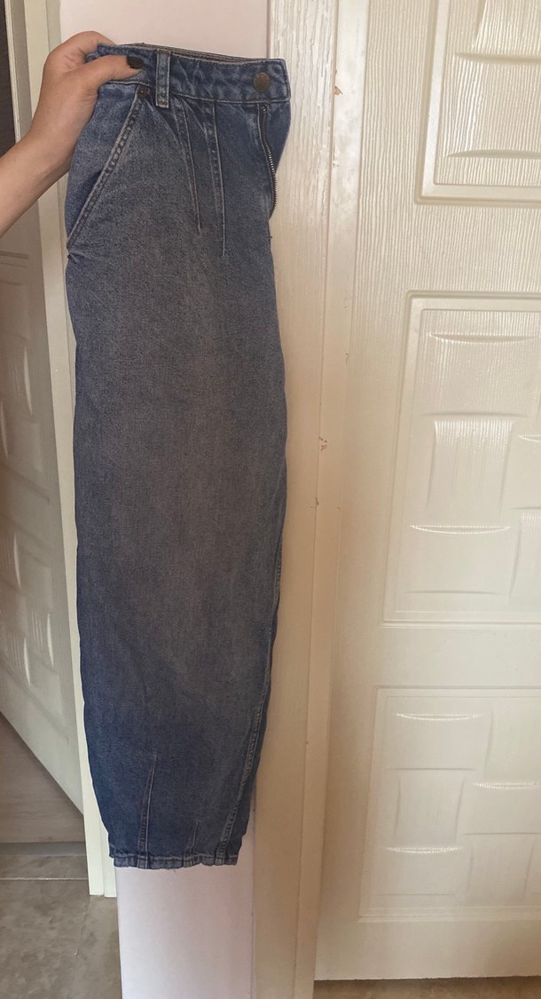 Gri renkte, kemerli ve bol kesim midi kot pantolon, günlük kullanıma uygun rahat ve şık bir tarza sahiptir.