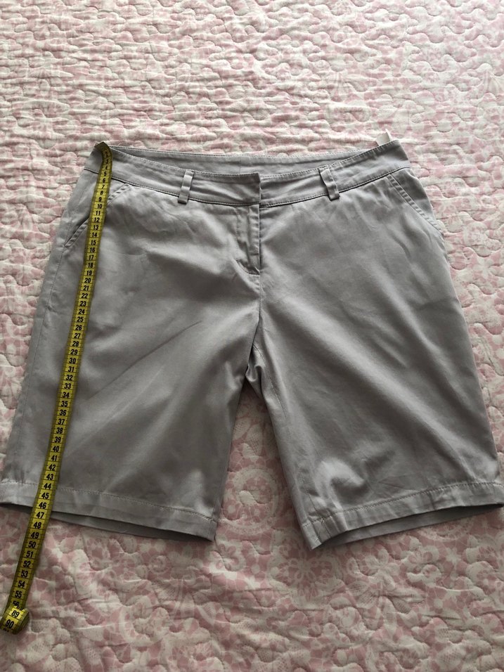 Gri renk, kemerli ve bol kesim mini bermuda şort. Sentetik kumaştan, günlük dış mekan kullanımı için uygundur.