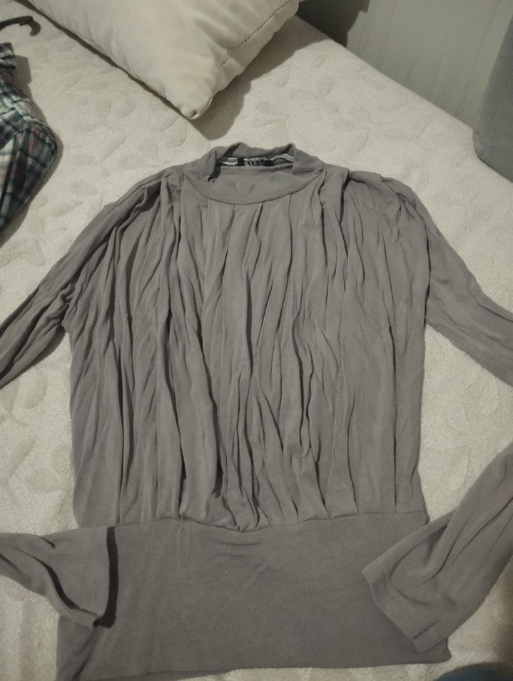 Keten kumaştan, balıkçı yakalı, gri renkte, drapeli ve uzun kollu, normal midi boyda, dar kesim kadın bluz. Günlük sokak stili için uygundur.