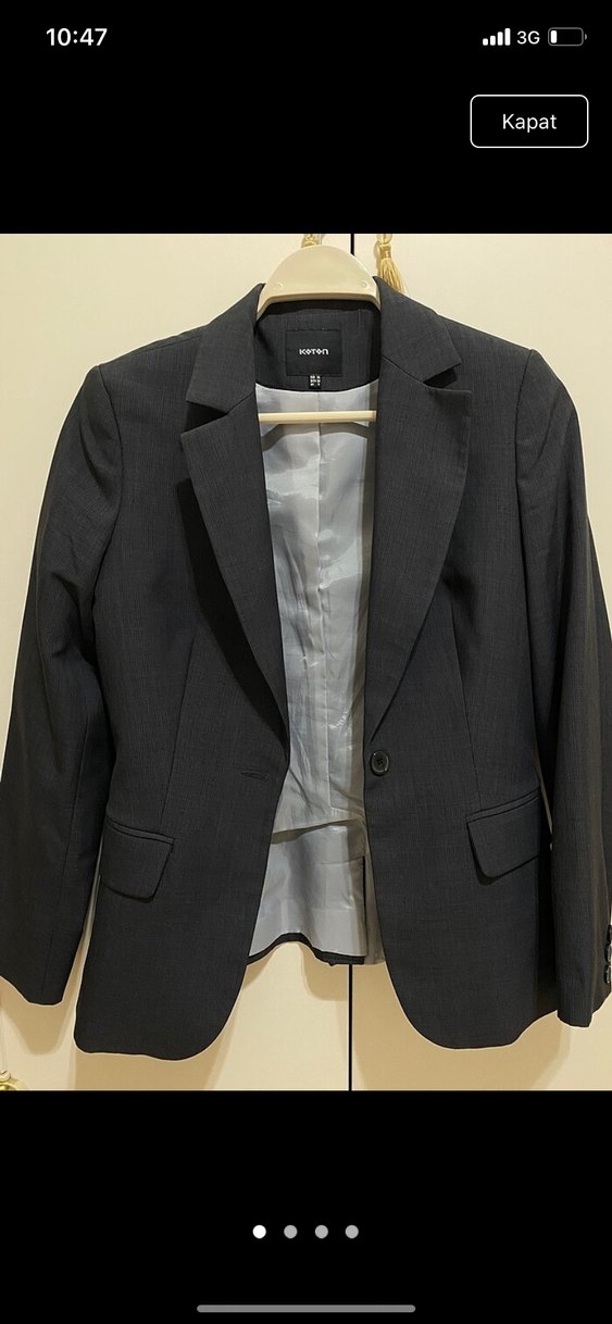 Gri renkte, keten kumaştan yapılmış, düğmeli, notched yaka ve uzun kollu kadın blazer ceket. Ofis ve günlük kullanıma uygun, midi boy ve regular fit.