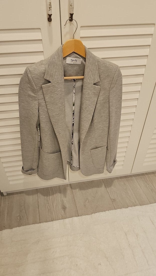 Gri keten kumaştan, uzun kollu, normal kesim ve düğmeli kadın blazer ceket. Cepli ve ofis kullanımı için uygun.1 kez giyildi 36 38 uyumlu