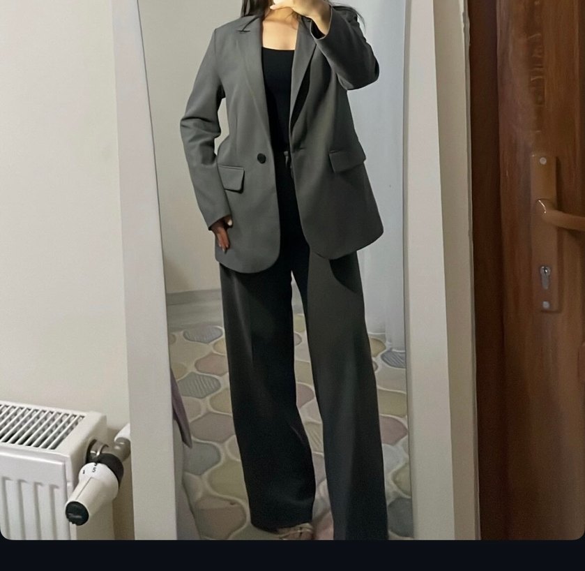 Gri keten kumaştan, normal kesim ve midi boyda, düğmeli, yakalı, uzun kollu kadın blazer ceket. Ofis için uygundur.