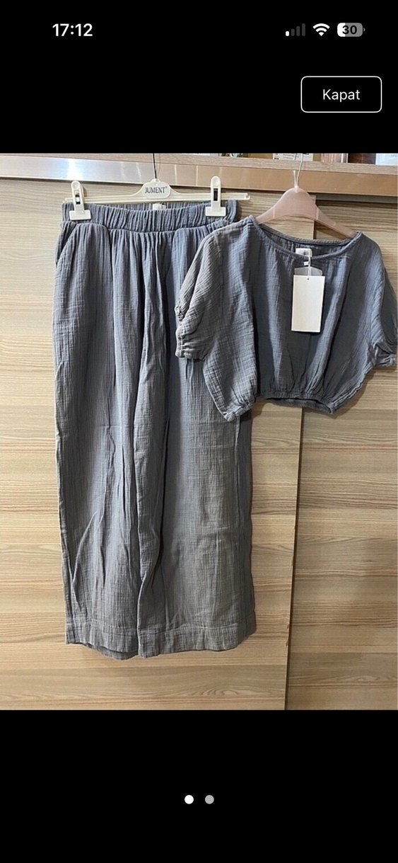 Gri Kadın Keten Bol Kesim Kısa Kollu Takım