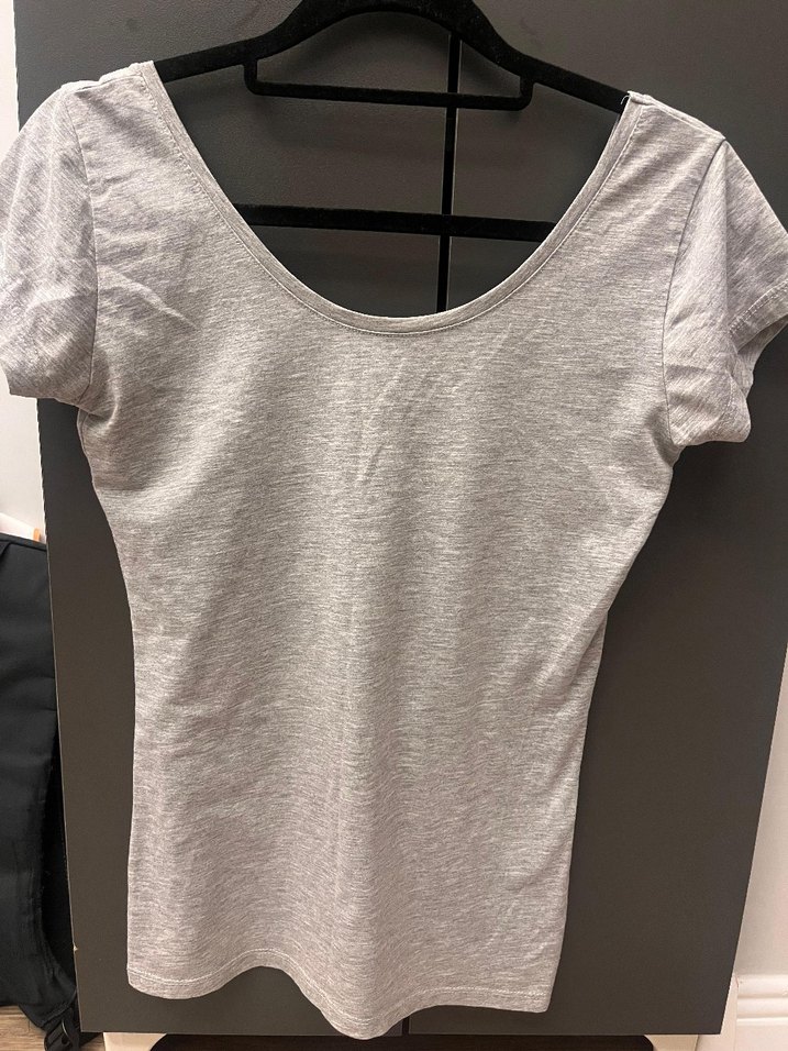 Gri renk, keten kumaştan, kısa kollu. sırt dekoltesi var biraz. 38 beden.
