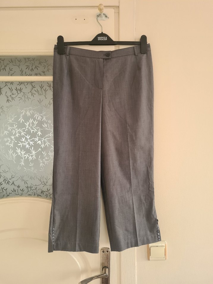 Gri renkte, keten kumaştan yapılmış, düğmeli detaylı, midi boy ve normal kesim kadın pantolon. İş ortamı için uygundur.