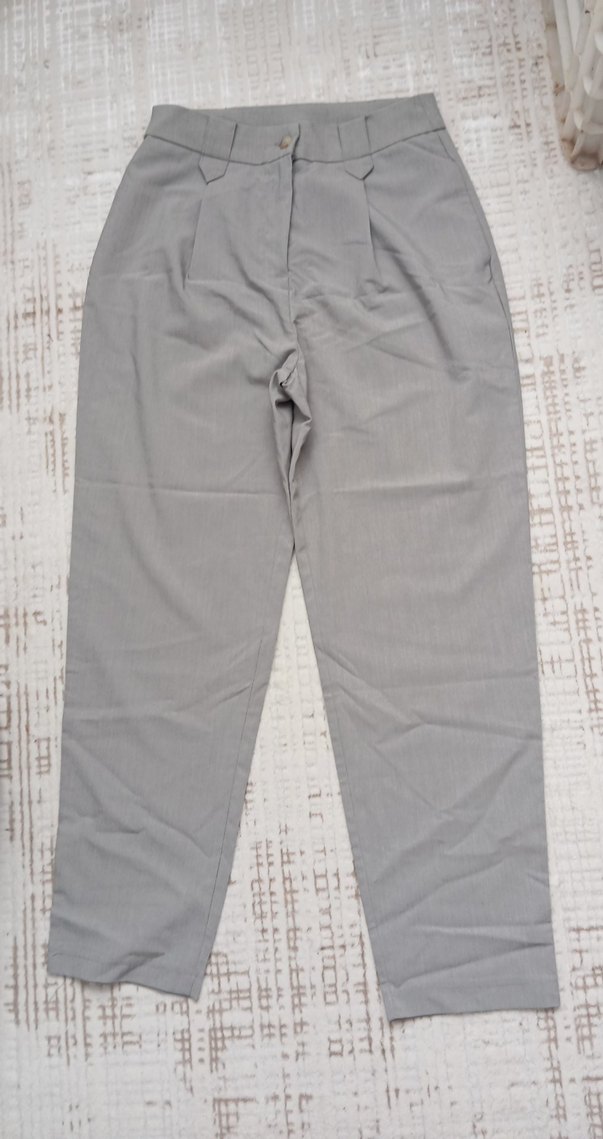 Gri keten kumaştan, midi boy, düz kesim kadın pantolon. Rahat ve şık, ofis için ideal, desensiz tasarımıyla cok şık bir kumaş pantolon, etiketlidir.36/38 beden uyumlu.