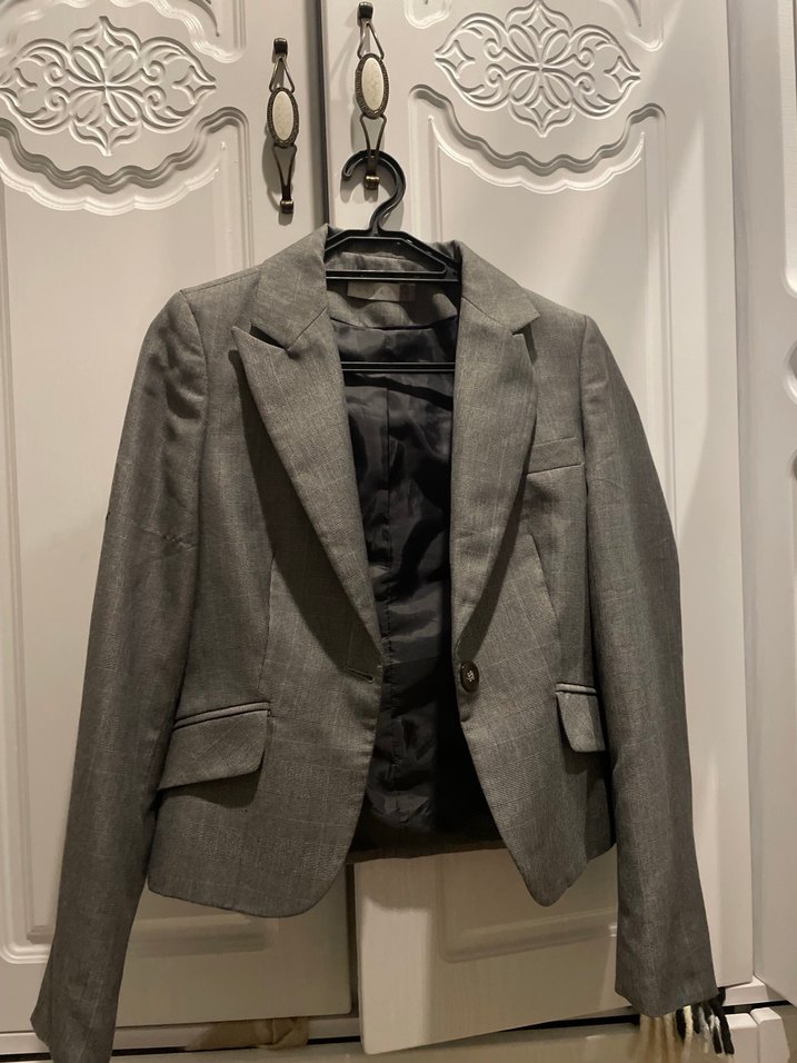 Gri renkli kadın keten kumaşlı, düğmeli ve normal boy uzunluğunda blazer. Uzun kollu, regular fit ve klasik şıklık sunar. Ofis için uygun, desen içermeyen model. Deformesi yoktur