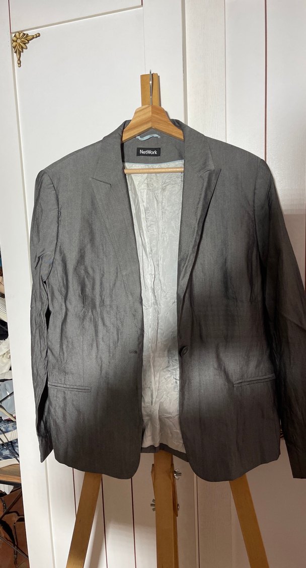 Gri keten kumaştan, yakası kesik, uzun kollu, düğmeli, normal kesim ve midi boy ofis blazerdir. Desensiz ve sade tasarıma sahiptir.
