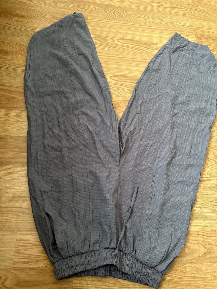 Gri keten kumaştan, bol kesim ve pilili detaylara sahip midi uzunlukta, günlük kullanıma uygun rahat ve sade kadın pantolonu.