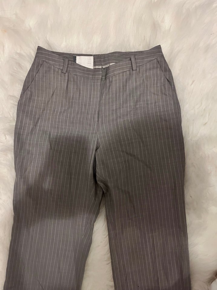 Gri keten kumaştan, pilili ve normal boyda kadın pantolon. Ofis ve günlük sokak tarzına uygun, rahat kesim ve desensiz tasarım.