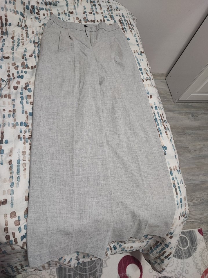Gri renkli, uzun keten kumaştan yapılmış, pilili ve regular fit kesime sahip kadın pantolonu. Minimalist ve sade tarzda, günlük kullanıma uygun.
