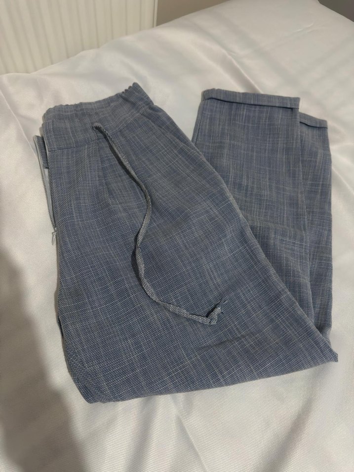 Gri keten kumaştan, pilili ve rahat kesimli midi uzunlukta kadın pantolon. Günlük kullanım için uygun, sokak stiline uygun.