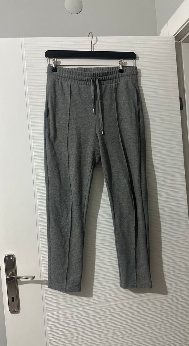 Gri keten kumaştan, rahat kesim ve belde bağcıklı, desen içermeyen günlük kullanıma uygun eşofman altı.