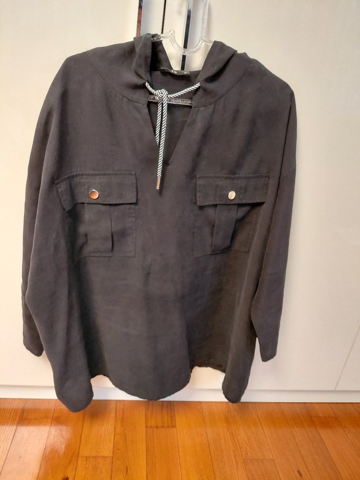 Gri keten kumaştan, uzun kollu, salaş kesim ve yakalı. Düğmeli cepler ve günlük rahat sokak stili sunar.
