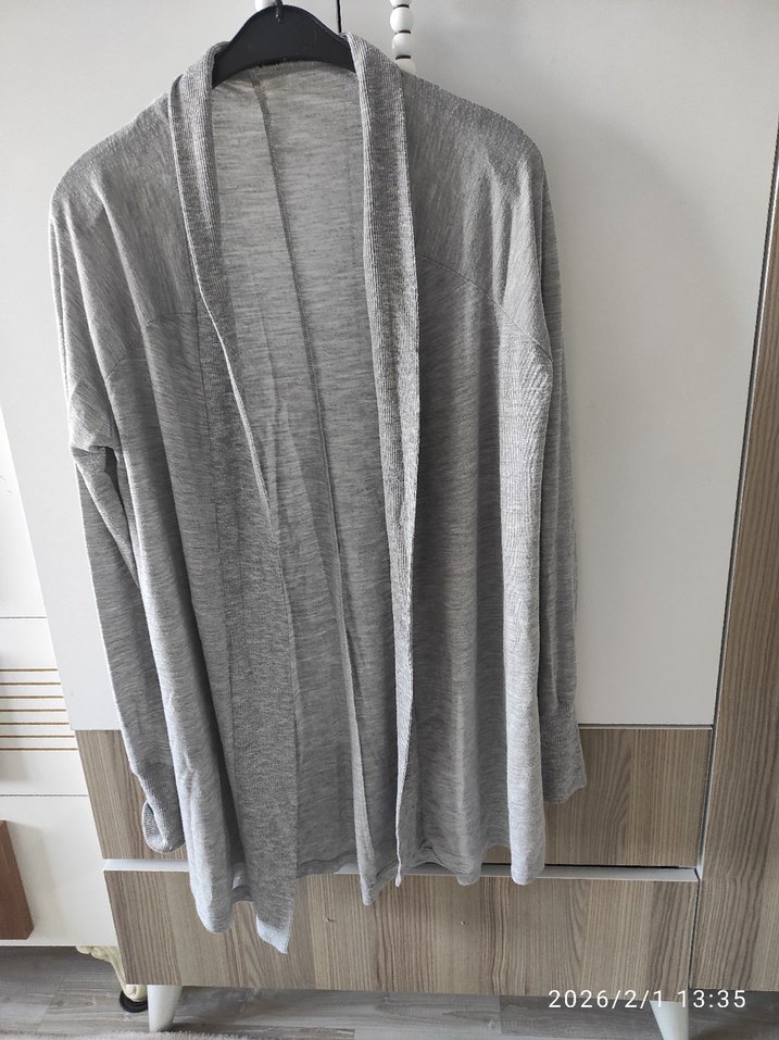 Gri keten kumaştan, salaş kesim, uzun kollu, yüksek yakalı ve midi boyda drapeli kadın hırkası. Rahat günlük kullanıma uygun.