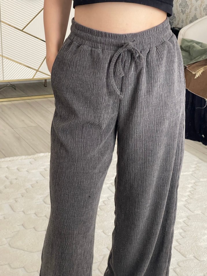 Gri keten kumaştan, salaş kesim ve pile detaylı, belden bağlamalı kadın pantolon. Günlük rahat sokak stili için uygundur.