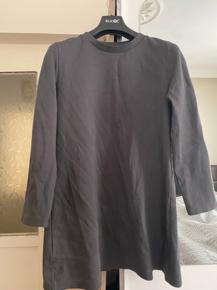Gri keten kumaştan, uzun kollu, yuvarlak yakalı, dökümlü ve salaş kesime sahip midi uzunlukta sade kadın tunik.