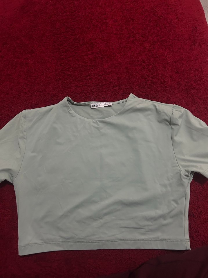 Gri renk, kısa kollu, yuvarlak yakalı, düz tasarımlı, sentetik kumaştan yapılmış, vücuda oturan crop tişört. Streetwear ve athleisure tarzına uygundur.