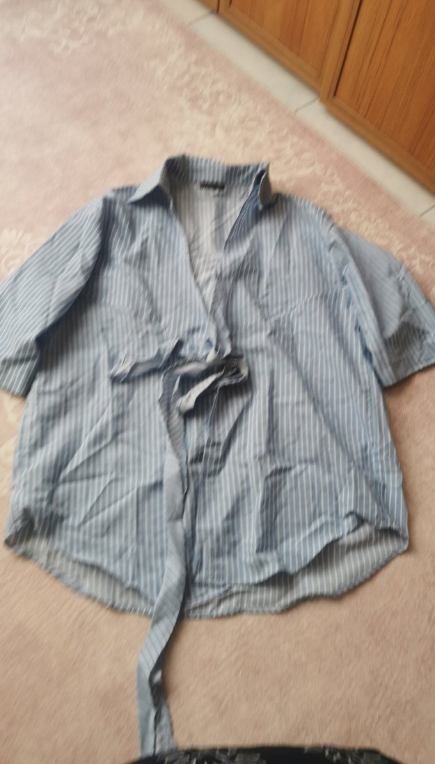Gri keten kumaştan, kısa kollu ve yakalı, düğmeli, belde bağlama detaylı rahat kesim gömlek. Günlük kullanıma uygun.