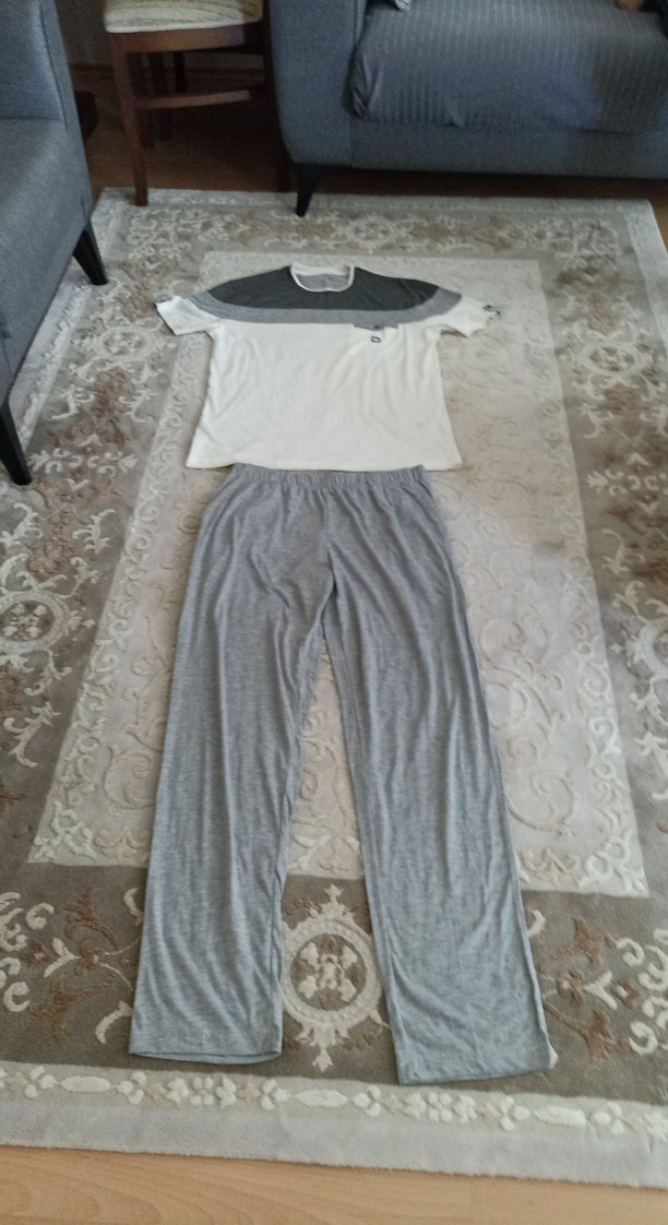 erkekler,için gevşek kesim, kısa kollu ve bisiklet yaka pijama takımı. Üst beyaz, gri detaylı; alt gri uzun pijama Rahat ve şık görünüm sunar.