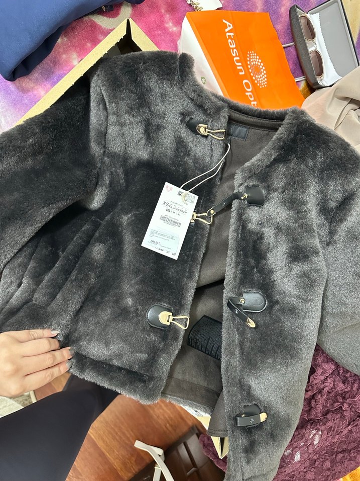 Gri renkli, peluş kürk detaylı, uzun kollu, yakalı ve fitted kesim kadın ceket. Sokak modasına uygun, yumuşak dokulu kumaştan üretilmiştir.