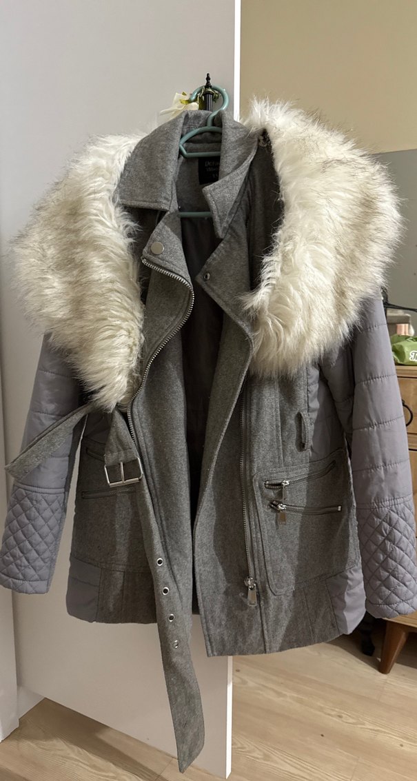 Gri renkte, kürklü yaka detayına sahip, fitted kesim midi kışlık mont. Yumuşak ve sıcak kumaş ile kapitone kollara ve fermuarlı ceplere sahiptir. Trendy ve rahat stil için uygundur. ❄️