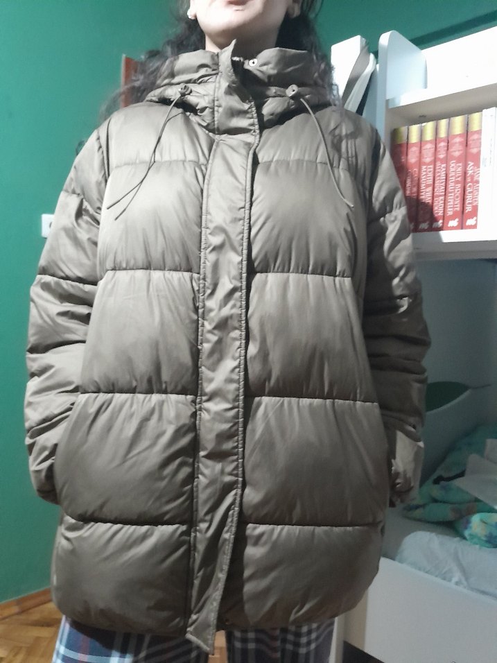 Gri kadın kışlık mont, bol kesim ve uzun kollu. Düğmeli, yumuşak ve sıcak kumaştan, günlük sokak stili için uygundur. ❄️