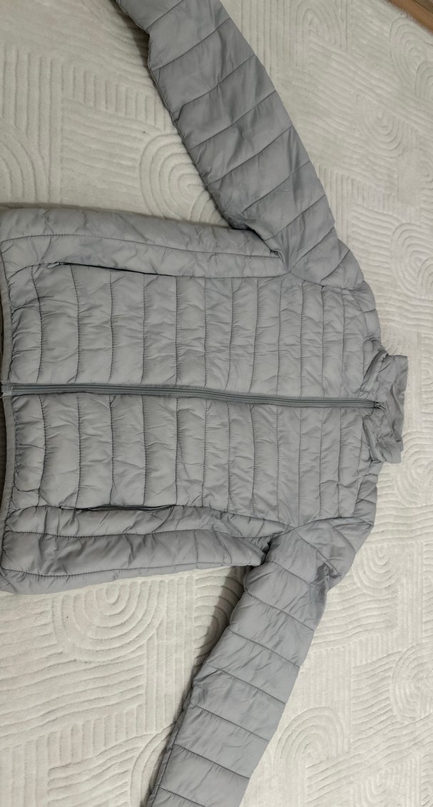 Gri tonlarında, yüksek yakalı ve uzun kollu kadın kışlık mont. Yumuşak sentetik kumaştan, fermuarlı ve midi boyda, günlük kullanıma uygun sıcak tutar. ❄️