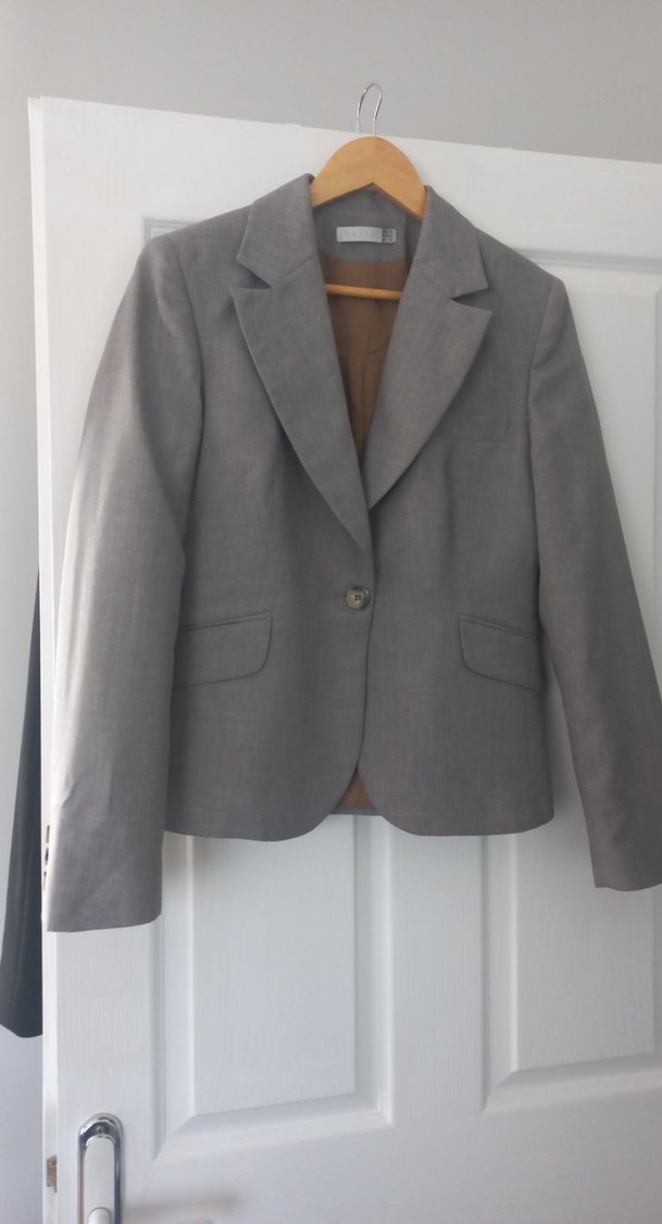 Gri renkli, keten kumaştan yapılmış, düğmeli ve klasik yakalı kadın ceket. Uzun kollu, normal boyda, ofis için uygun, sade ve şık bir tasarıma sahiptir.