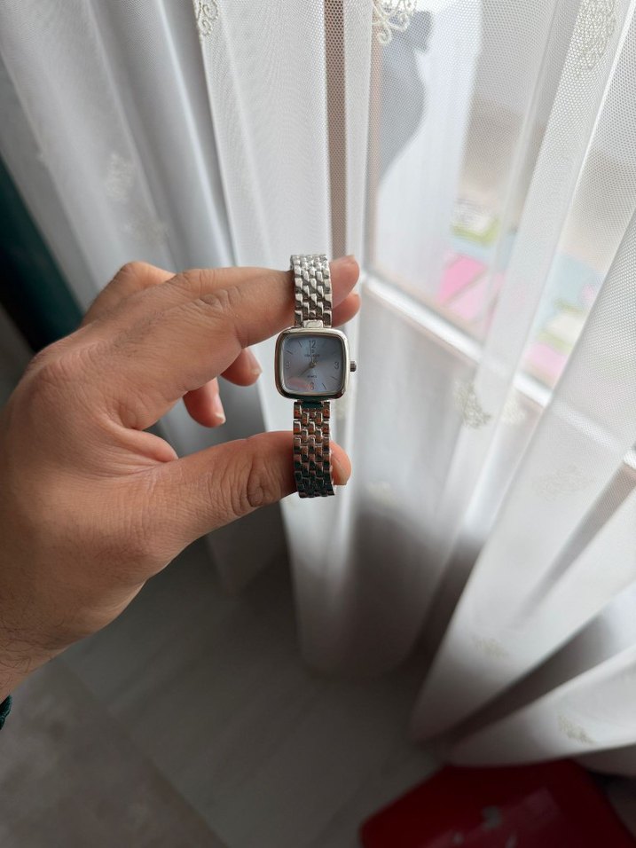 Gri kare kadranlı, metal tokalı kayışa sahip minimalist kadın kol saati. ⌚