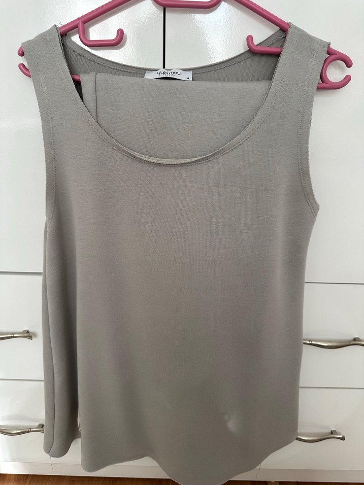 Gri renkte, yuvarlak yakalı, kolsuz ve bol kesimli kadın alt üst takım. Beli lastikli ve ceplidir. Düz, desensiz tasarımı ve yumuşak sentetik kumaşı günlük kullanıma uygundur.