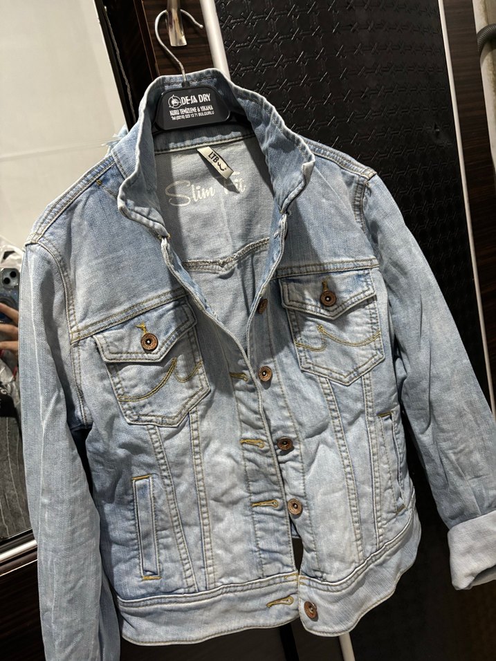 Gri renkli, düğmeli, kesimli ve kısa boy kadın denim ceket. Uzun kollu, sokak stiline uygun rahat bir tasarım.