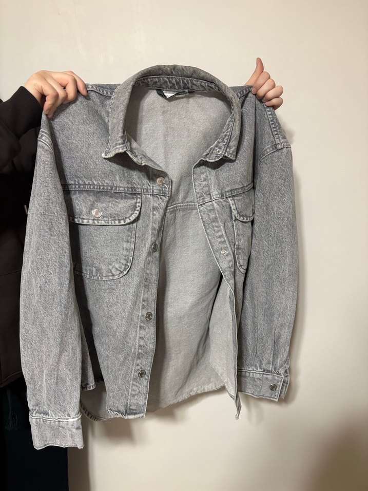 Zara markalı gri kadın kot ceket. Düğmeli, uzun kollu ve baskılı desene sahiptir. Günlük sokak stiline uygundur.
