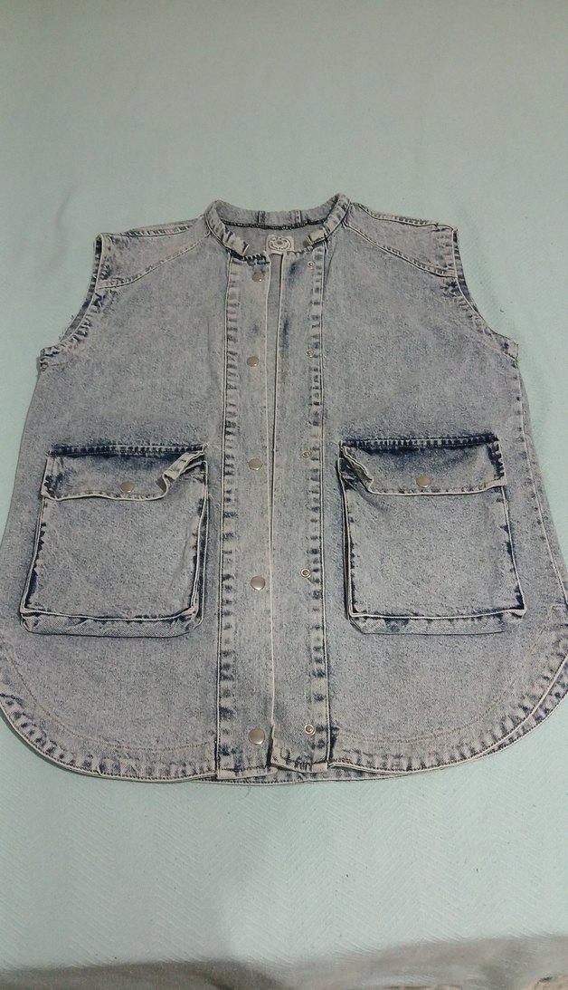 Kolsuz, gri denim kot ceket, yuvarlak yaka ve düğmeli kapama ile. Bol kesim ve büyük ön cepler, rahat sokak stili için uygun.