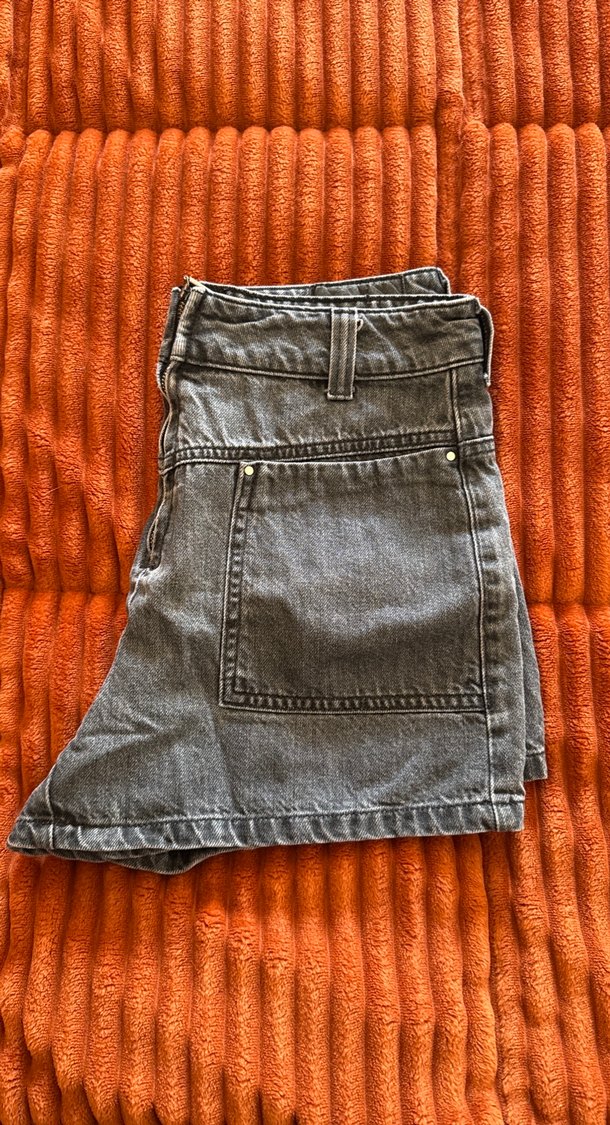 Gri kot kumaştan, kemerli ve bol kesim mini kadın şort. Desensiz, günlük rahat sokak stili için uygundur.