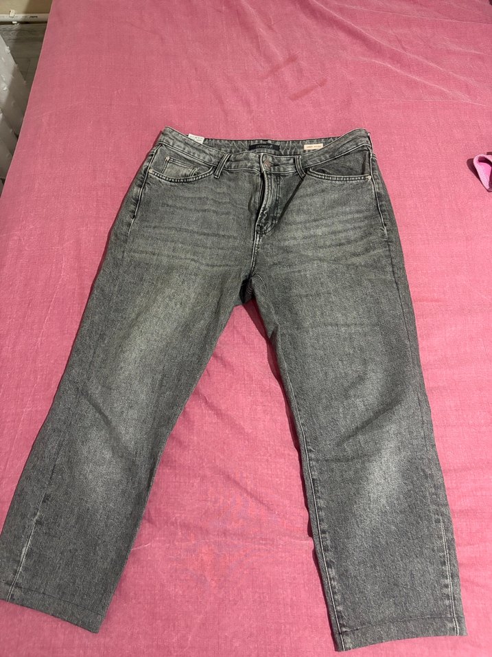 Gri denimden, bol kesim ve normal uzunlukta kadın kot pantolon. Tokalı detaya sahip, desensiz sade tasarım, günlük kullanıma uygun.