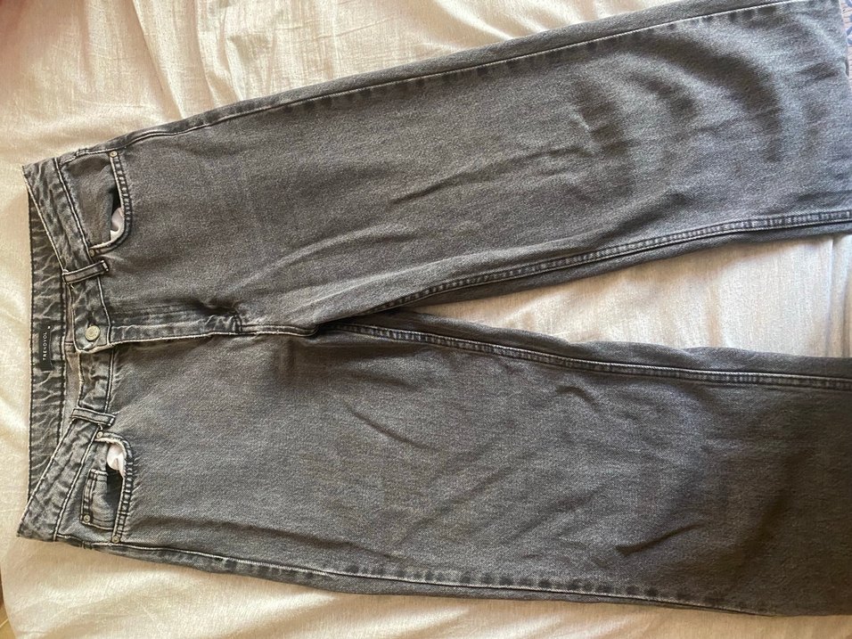 Gri renkte, bol kesim kadın kot pantolon.Sade tasarımıyla günlük kullanıma uygundur. 109 cm’dir ve katlanma dolayısıyla iz oluşmuştur ben 160 boyla uzun geldiği için ordan katlıyordum