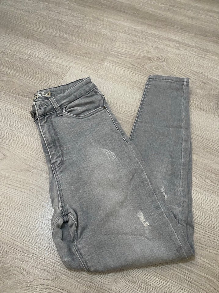 Gri kot kumaştan, kemerli ve dar kesim kadın pantolon. Midi boyda, sade tasarım, günlük sokak stiline uygun.