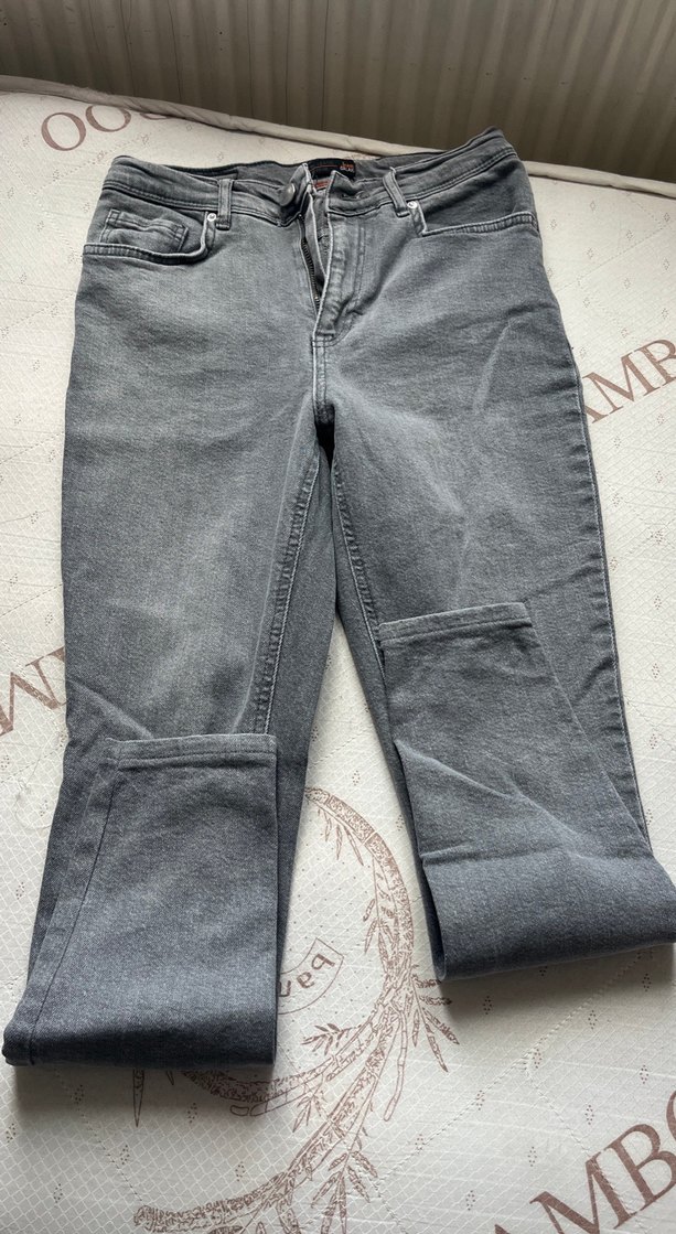 Gri renkli, bel detaylı, midi boy kot pantolon. Rahat kesimiyle günlük kullanıma uygundur.
