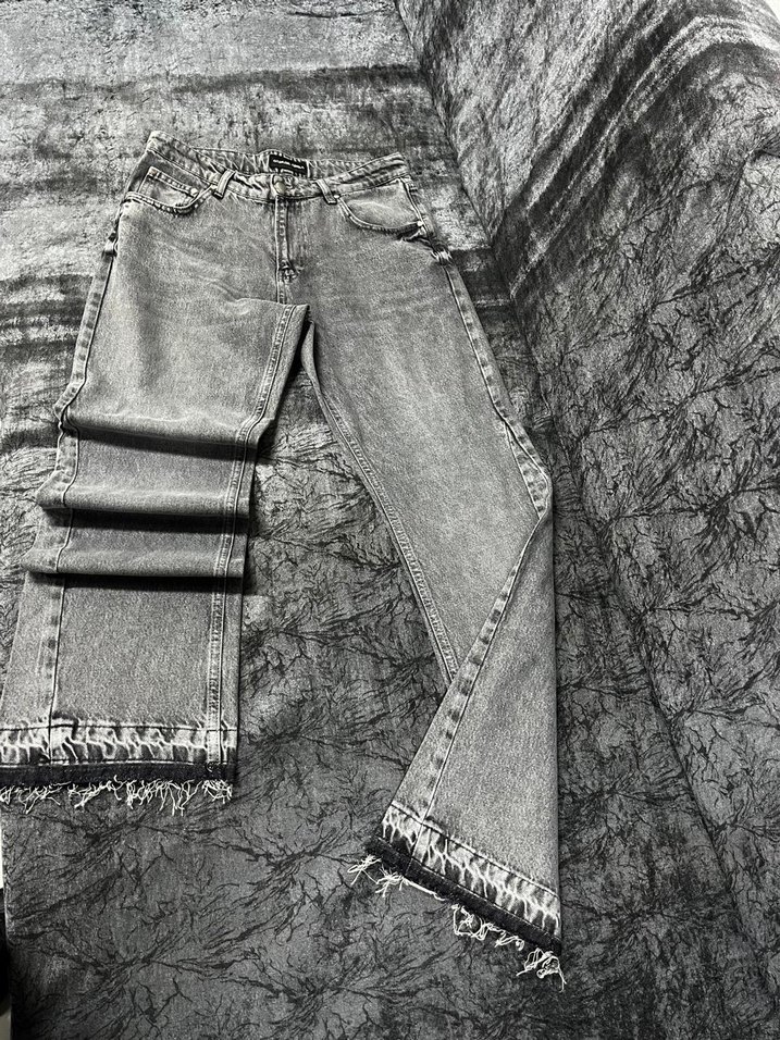 Gri renkte, kemerli, midi boy, normal kesim kadın kot pantolon. Sokak stiline uygun, günlük kullanıma elverişli, paçaları püsküllü jeans.