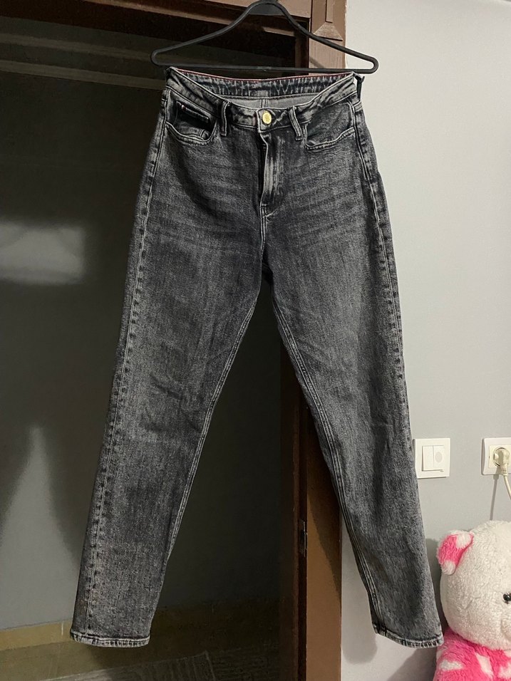 Normal boy, gri denim kumaştan yapılmış, kemer tokalı kadın kot pantolon. Günlük kullanıma uygun, desen içermeyen, normcore tarzda midi uzunlukta.