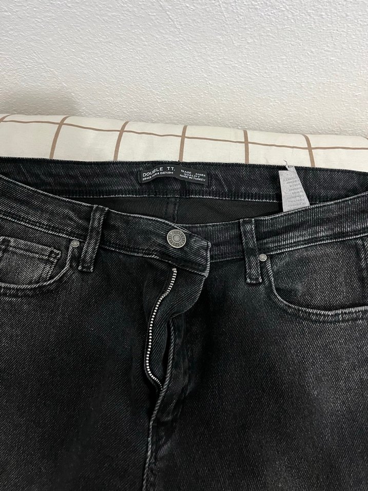 Gri denim kumaştan, rahat kesim ve normal midi boyda kadın kot pantolon. Tokalı bel kısmı ve desensiz tasarımıyla günlük kullanıma uygundur.