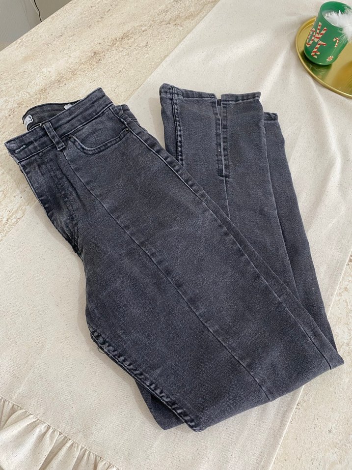 Gri renkli, yırtmaç detaylara sahip, normal boy kot pantolon. Rahat ve şık, günlük kullanıma uygun.