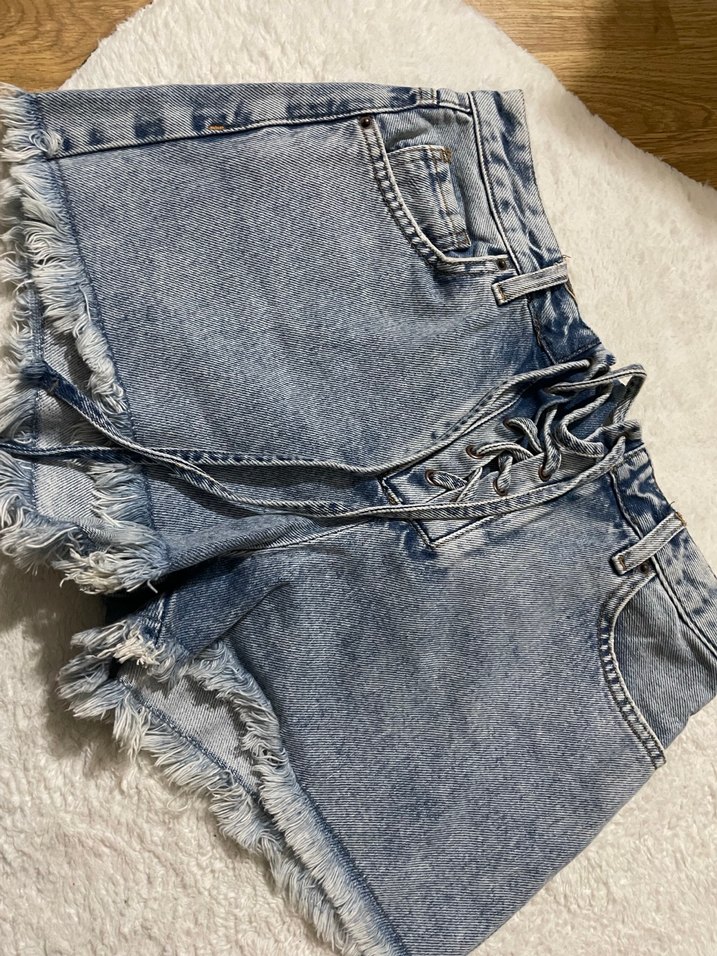 Gri batik desenli, bol kesim ve kısa boy kadın kot şort. Kürk detaylı, rahat ve sokak stiline uygun.