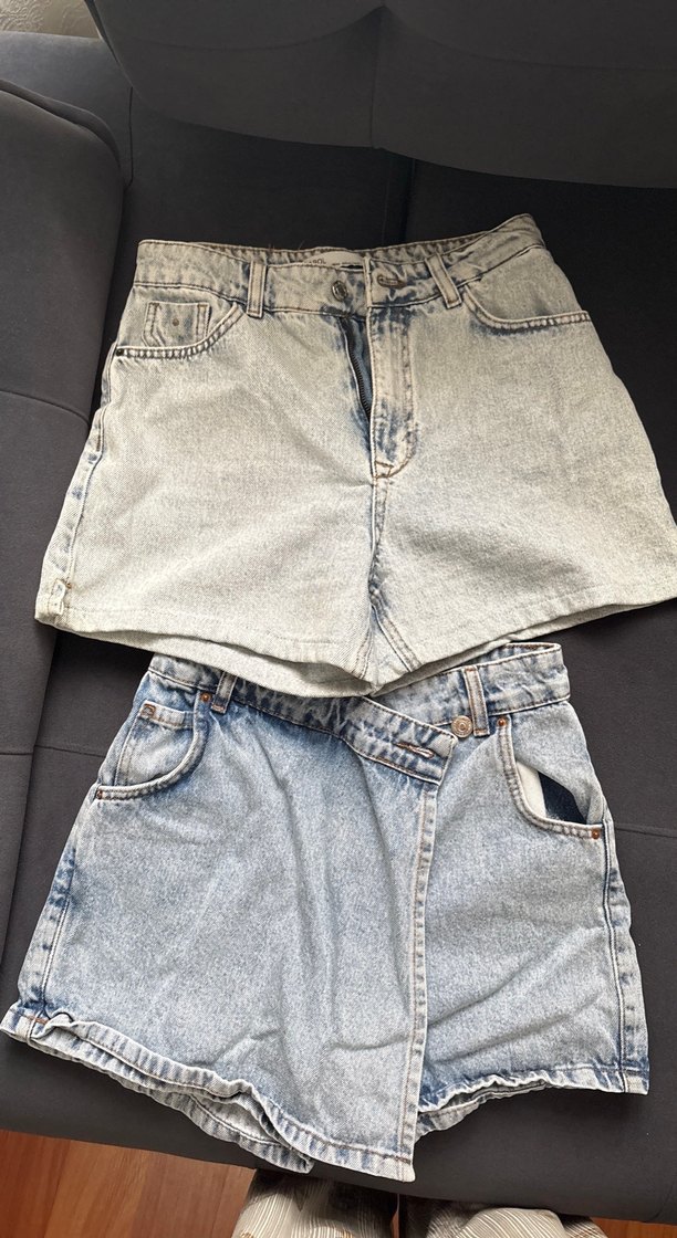 Gri renkli, mini boy, bol kesim kadın kot şortlar. Birinde tokalı detay bulunur, günlük sokak stili için uygundur.